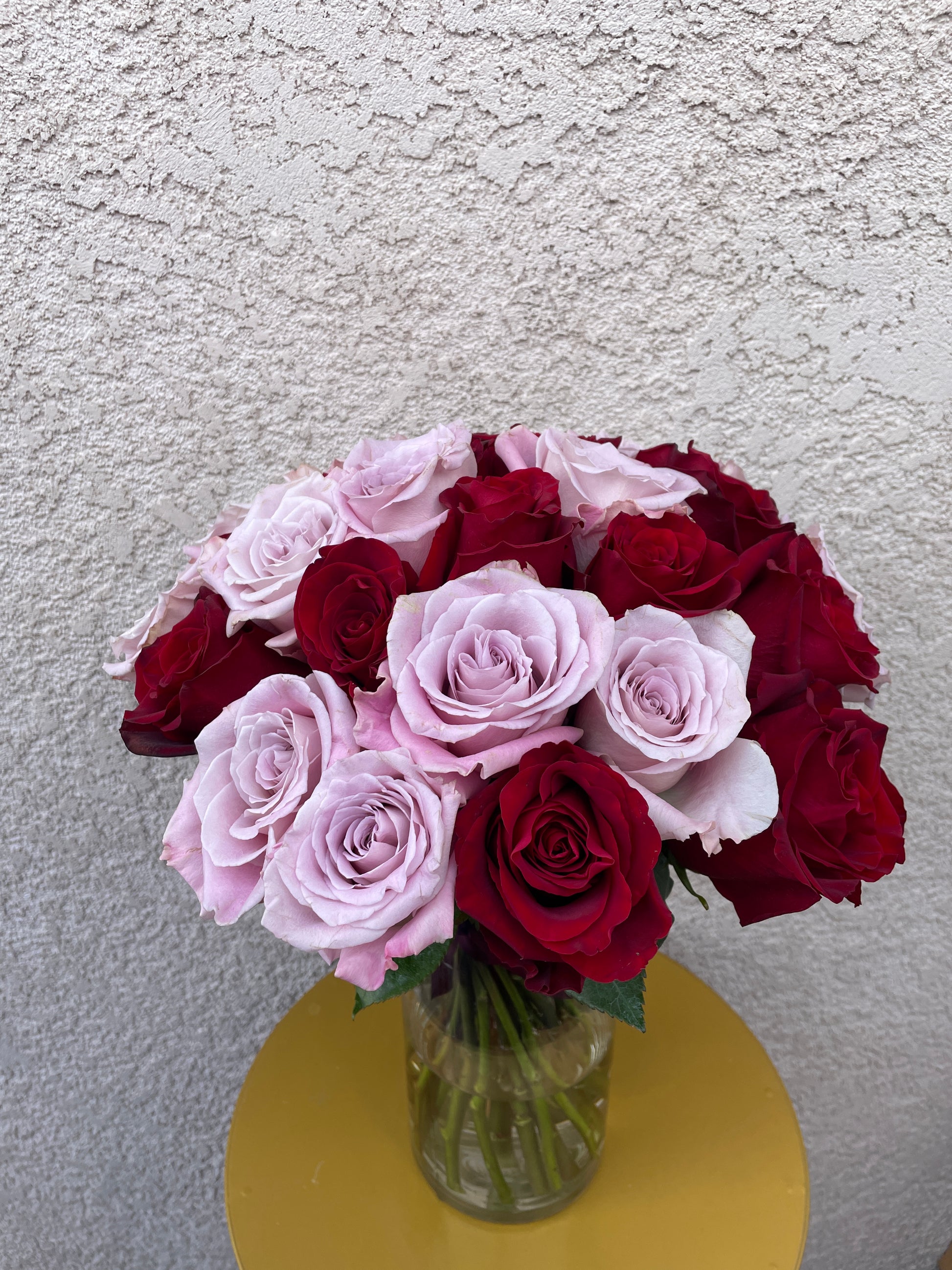 2 Dozen Mix of roses (pink and red) in glass vase.